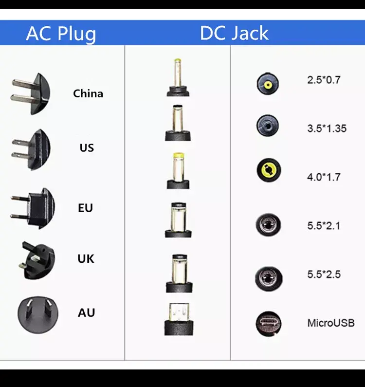 Tipo de conector: Conector cilíndrico de CC estándar (los tamaños comunes incluyen 5,5 mm × 2,1 mm o 5,5 mm × 2,5 mm, personalizable según los requisitos del dispositivo).