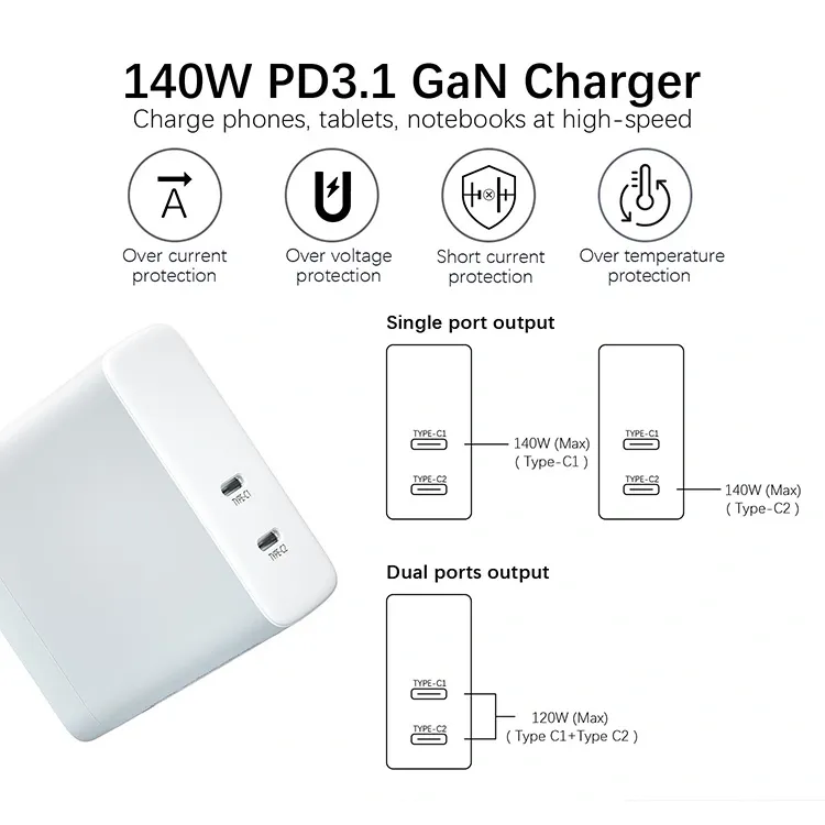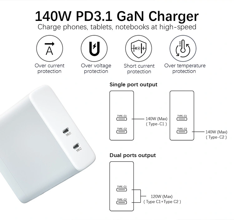 Cargador PD con doble puerto USB C de 140 W, enchufe estadounidense plegable: el puerto único puede proporcionar hasta 140 W de potencia. La potencia de salida de los dos puertos se asigna de forma inteligente y simultánea. Al cargar un portátil y un teléfono móvil al mismo tiempo, la eficiencia se mantiene sin cambios.
