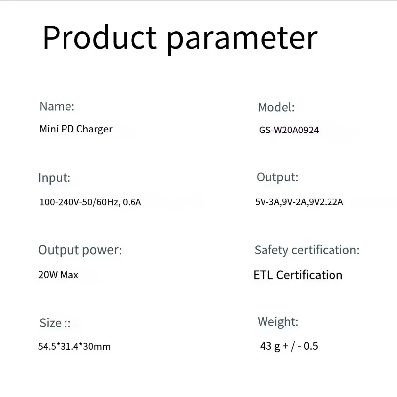 Especificación del cargador PD con enchufe versión japonesa de 20W: