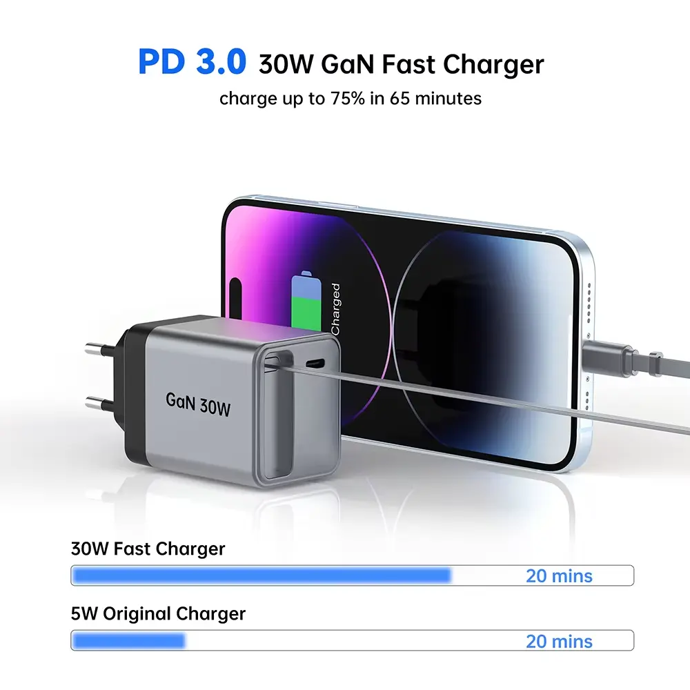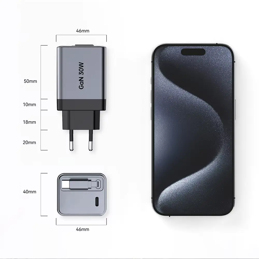 El diseño ultraligero y de tamaño de bolsillo del cargador rápido de 30 W con cable retráctil tipo C facilita su transporte. Es la elección perfecta para el hogar, la oficina o los viajes.