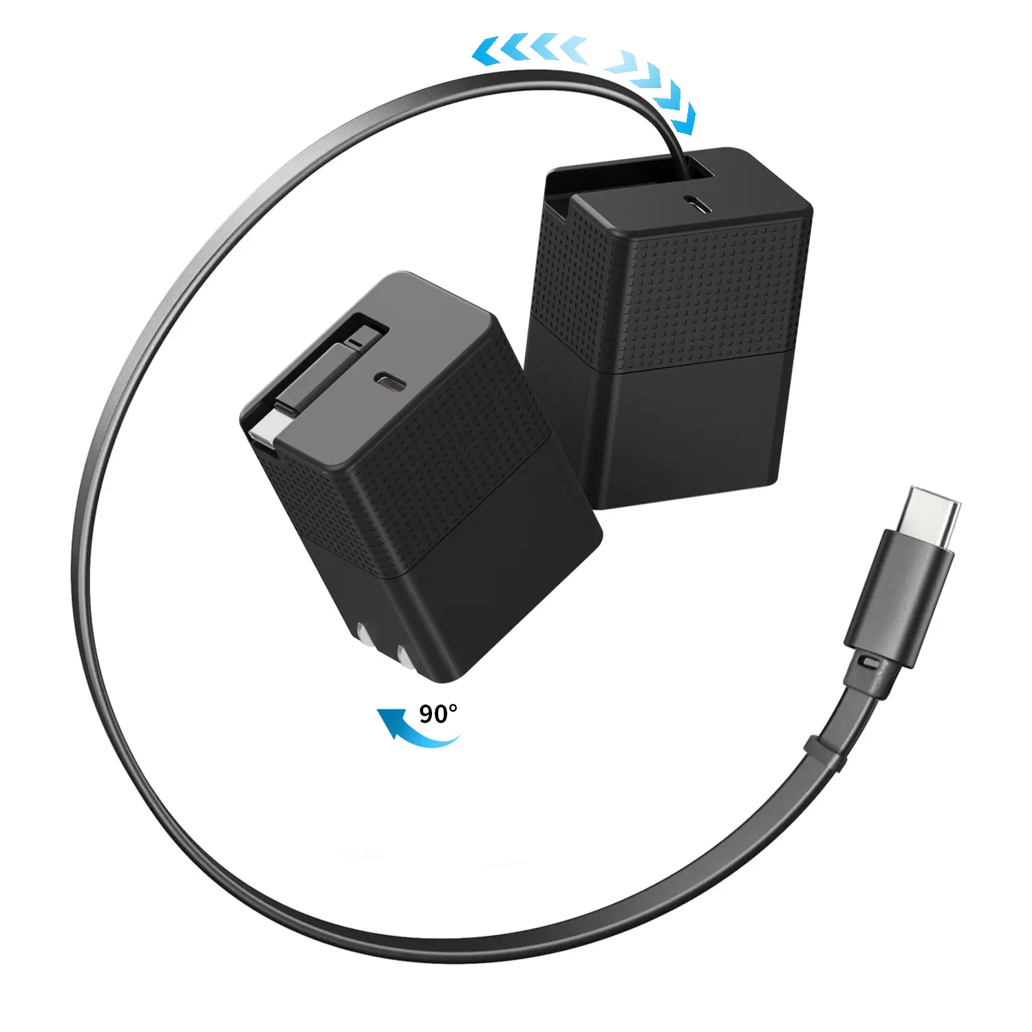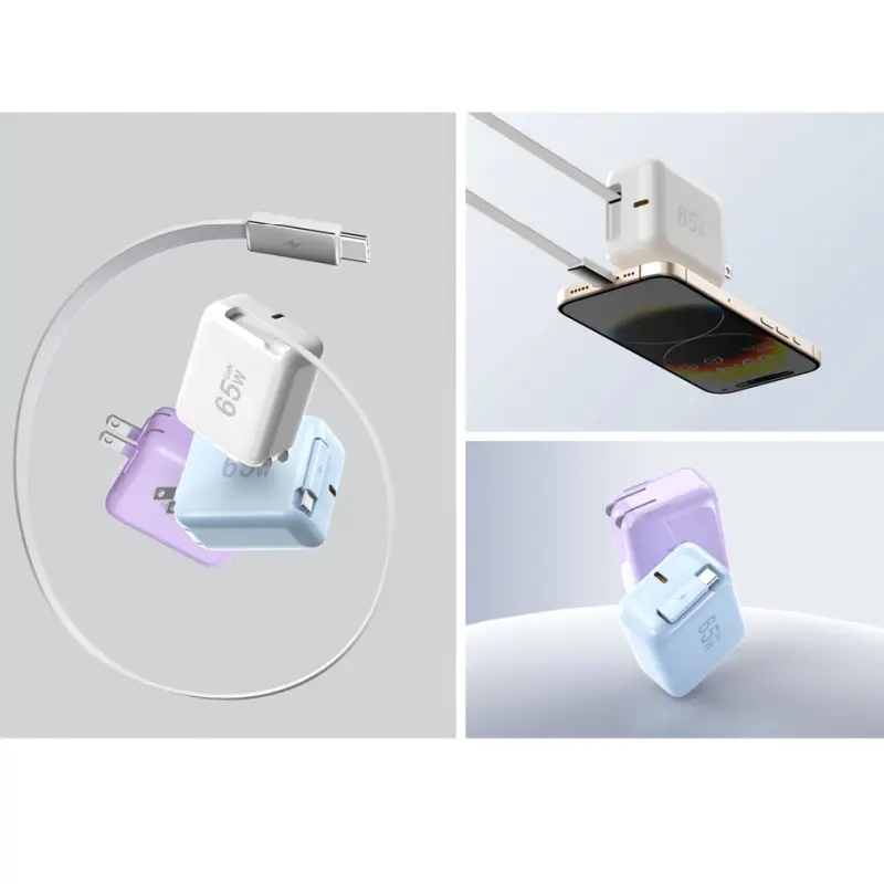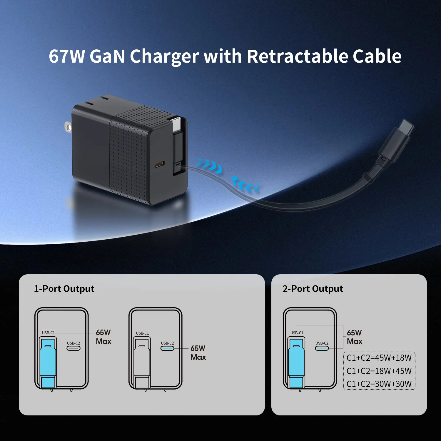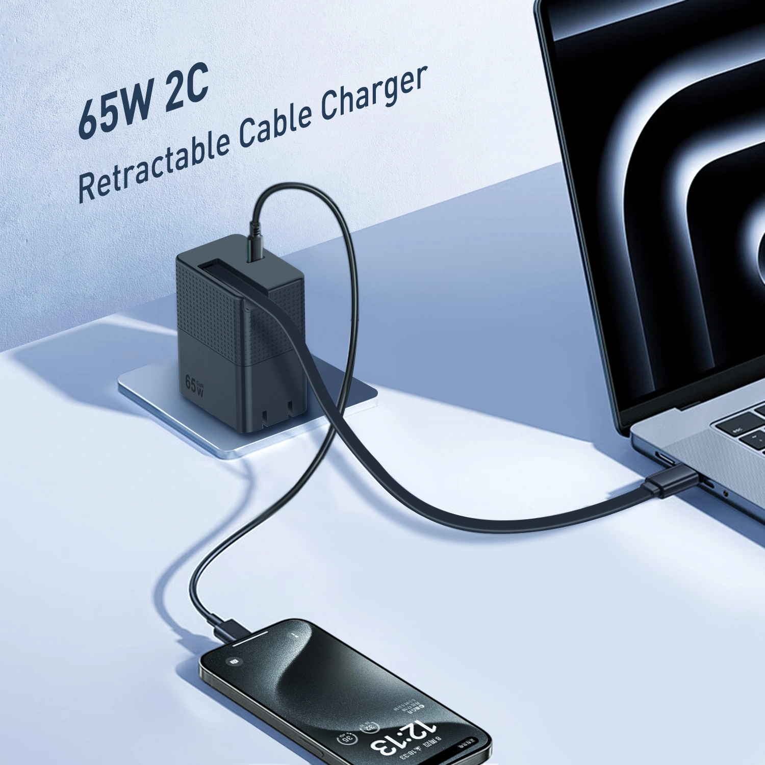 Equipado con cables retráctiles: el adaptador de carga rápida de 65 W está equipado con un cable de datos USB-C conveniente y que no se enreda de 1 metro (2,3 pies) de largo. Este cable se puede extender y retraer suavemente, evitando así el desorden de cables enredados y garantizando que puedas cargar en cualquier momento.