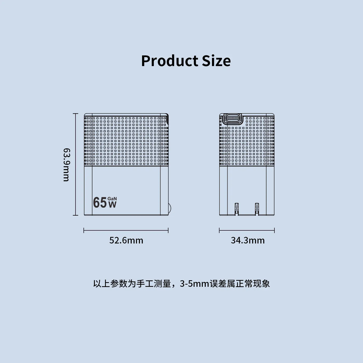 Puertos USB-C duales: el cargador PD 3.0 de 65 W puede cargar dos dispositivos simultáneamente. Durante los dos procesos de carga, la potencia se asigna en 45W y 20W.