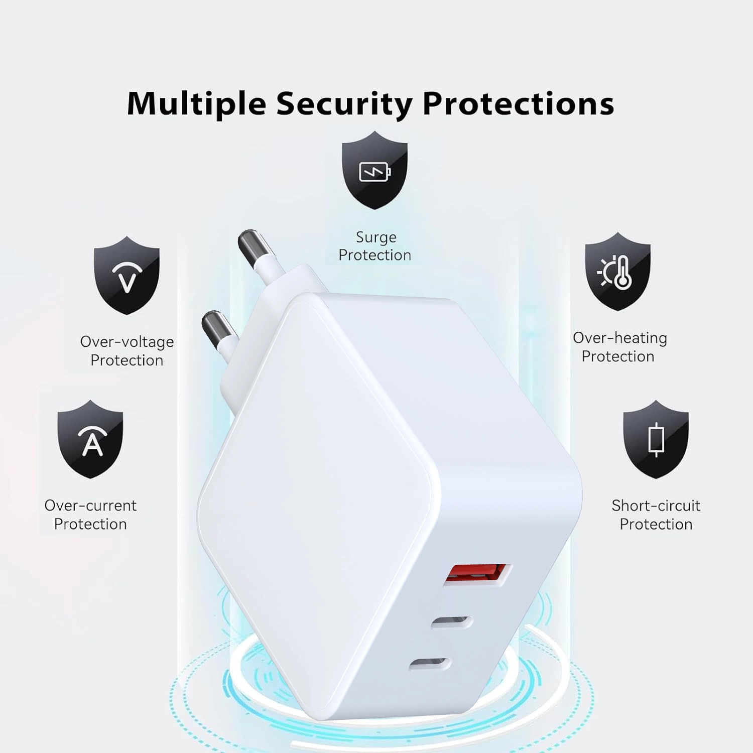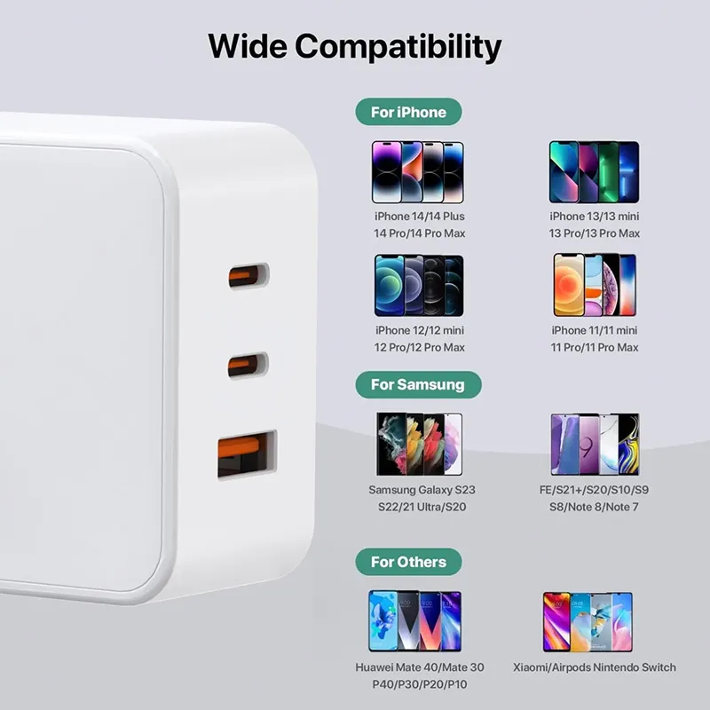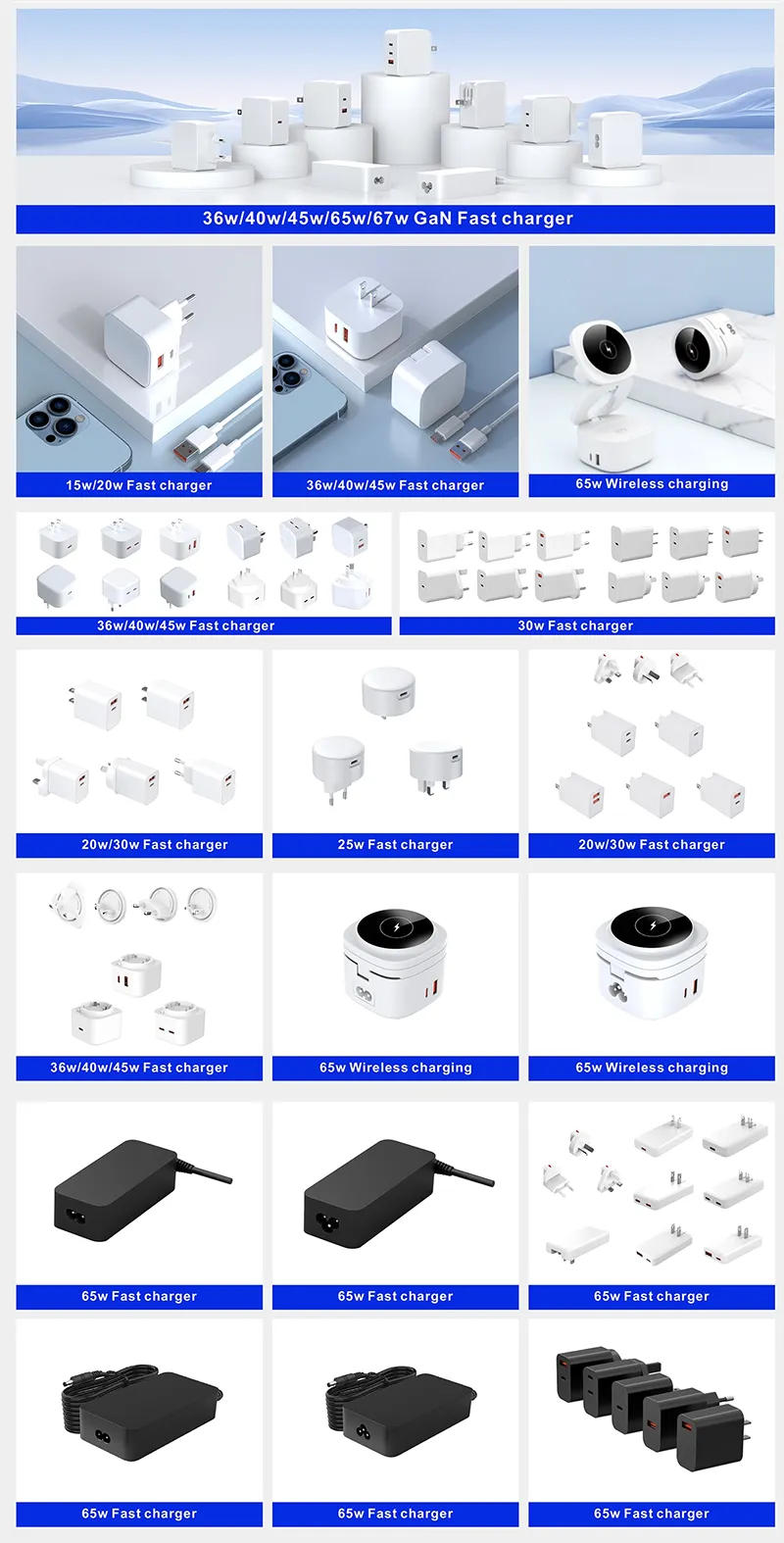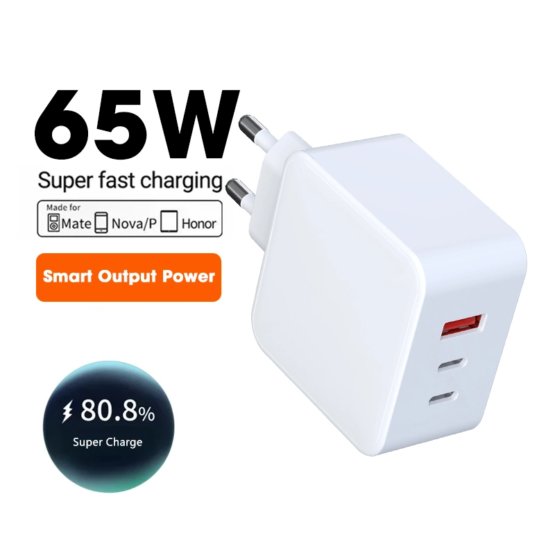 Este cargador ofrece hasta 65 W de potencia constante y carga eficientemente computadoras portátiles (por ejemplo, MacBook Air/Pro, Dell XPS), tabletas, teléfonos inteligentes (iPhone, Samsung Galaxy) y otros dispositivos compatibles con el protocolo PD. Su diseño compacto y liviano lo hace ideal para viajar, mientras que la protección incorporada contra sobretensión, sobrecorriente y cortocircuito garantiza una carga segura del cargador y los dispositivos conectados. Por lo general, está equipado con 1 o 2 interfaces USB-C, que admiten la carga de varios dispositivos pequeños al mismo tiempo, equilibrando potencia y comodidad.