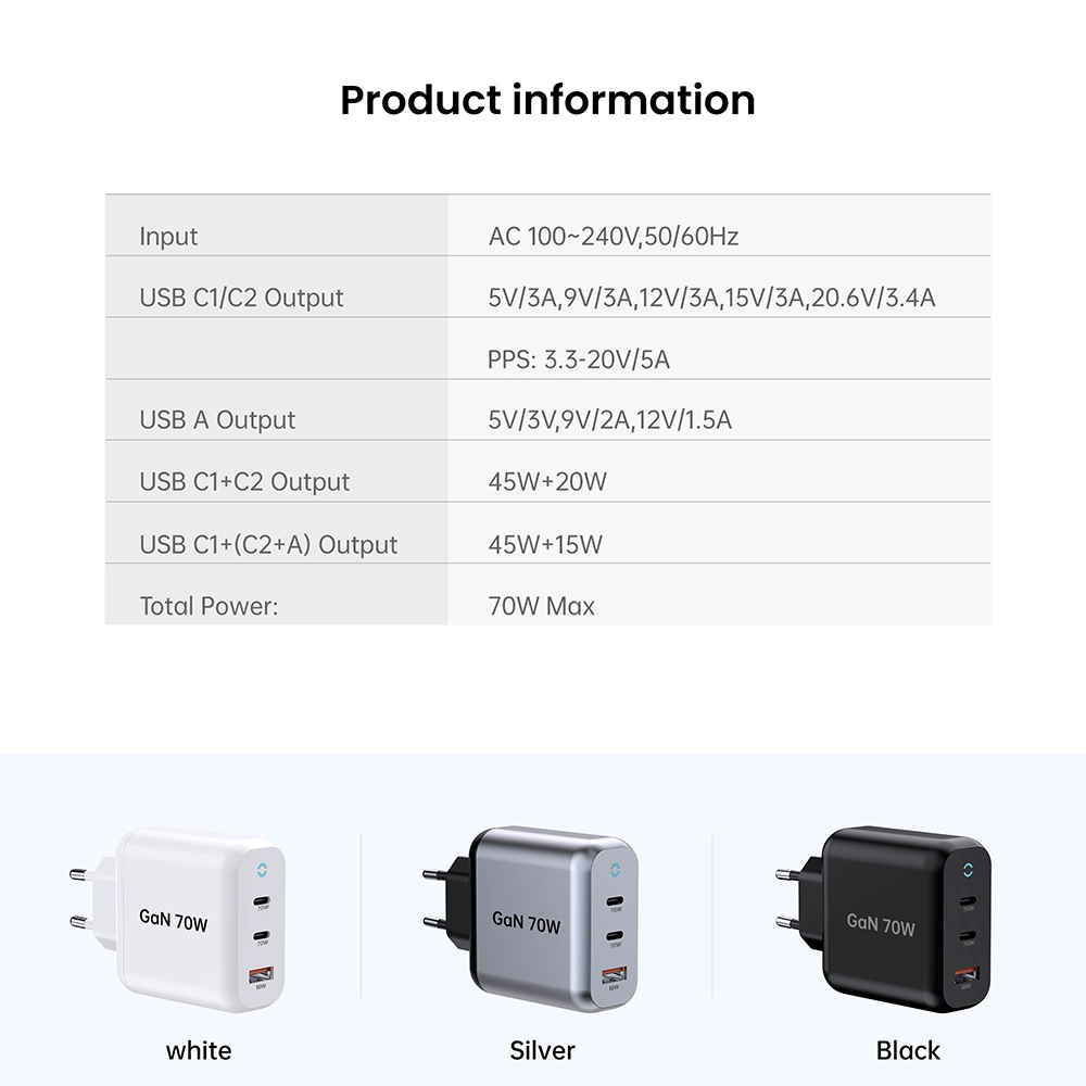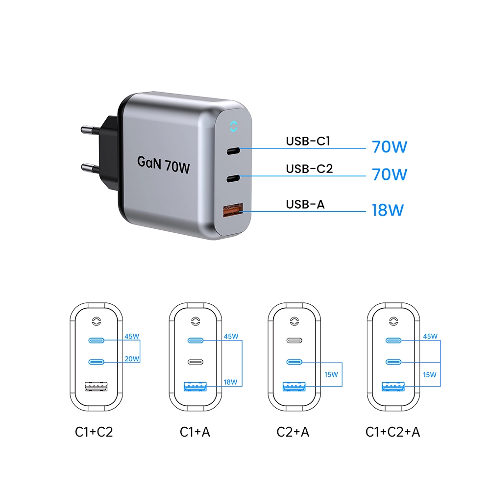 Salida C1/C2: 5V3A,9V3A,12V3A,15V3A,20.6V3.4A (70W máx.) PPS: 3.3-11V 4.05A Salida USB-A: 5V3A, 9V2A, 12V1.5A 3,3-11V 2A (22W máx.) Salida C1+C2: 45W+20W C1+C2+USB-A Salida: 45W+5V3A Total: 70W |
