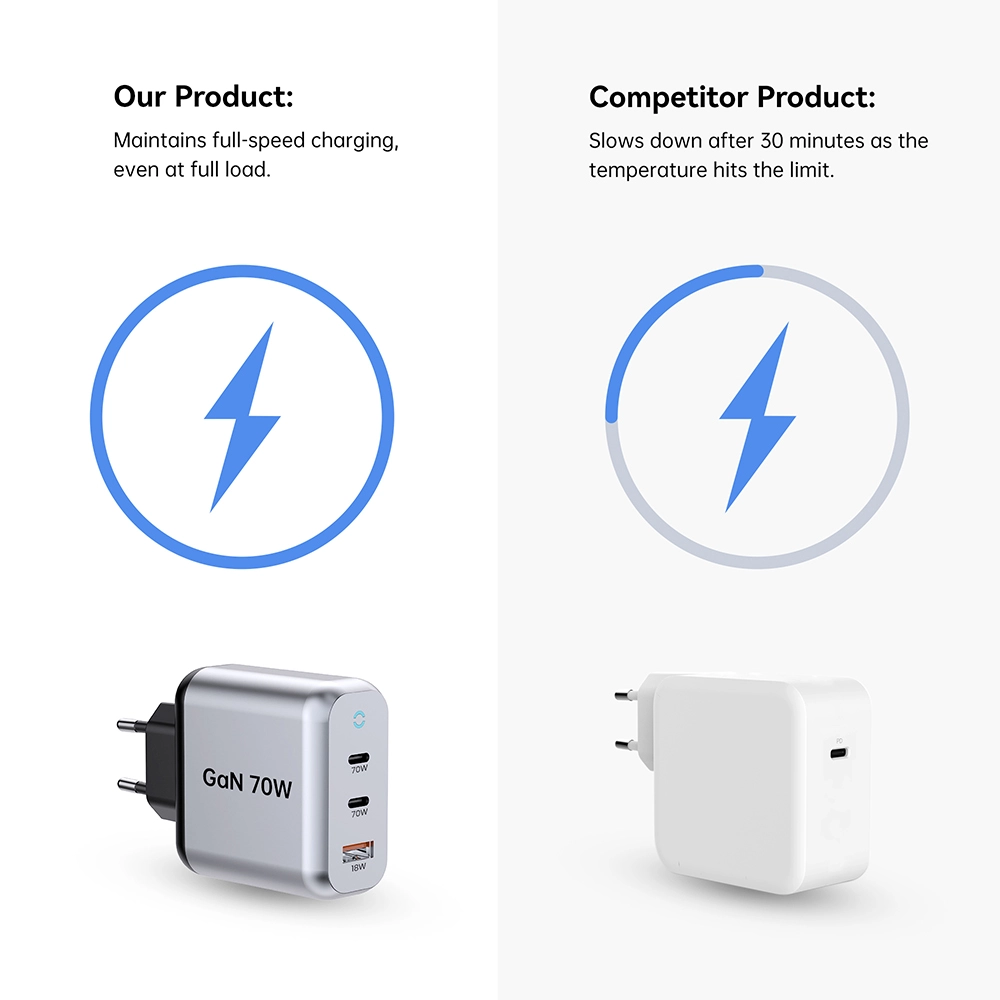 Cargador rápido Starwell duradero de 70 W PD para tableta latpop, también llamado cargador rápido GaN de 70 W: 2C1A, que satisface la necesidad diaria de carga rápida de teléfonos móviles y tabletas. De tamaño pequeño, potente en rendimiento y con tecnología avanzada de nitruro de galio. Cuando se utiliza en un solo puerto, la potencia de salida máxima de la interfaz USB-C1 es de 70W. Cuando los dos puertos se usan juntos, USB-C1 aún mantiene una carga rápida PD de 45 W. Admite múltiples protocolos de carga rápida, incluidos PD3.0, PPS, QC4+ y QC3.0, lo que garantiza una amplia compatibilidad con varios dispositivos