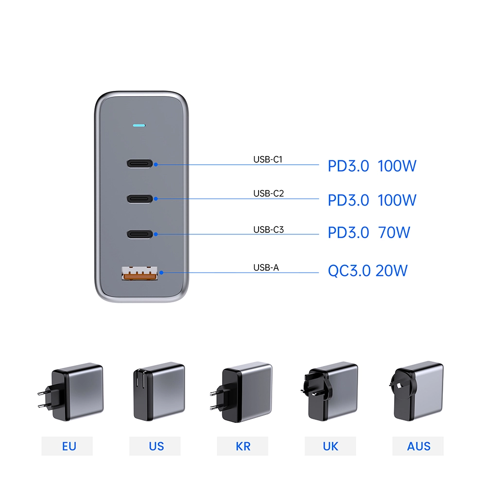 Salida C1/C2: 5V3A, 9V3A, 12V3A, 15V3A, 20V5A, PPS: 3,3-20V5A (100W máx.) Salida C3: 5V3A, 9V3A, 12V3A, 15V3A, 20V3.5A, (70W máx.) PPS: 3,3-11V5A Salida USB-A: 5V3A, 9V2A, 12V1.67A, SCP: 3.3-11V2A (22W máx.) C1+C2/C1+C3 Salida: 70W+30W C1+C2+(C3+USB-A) Salida: 40W+40W+15W Total: 100W |