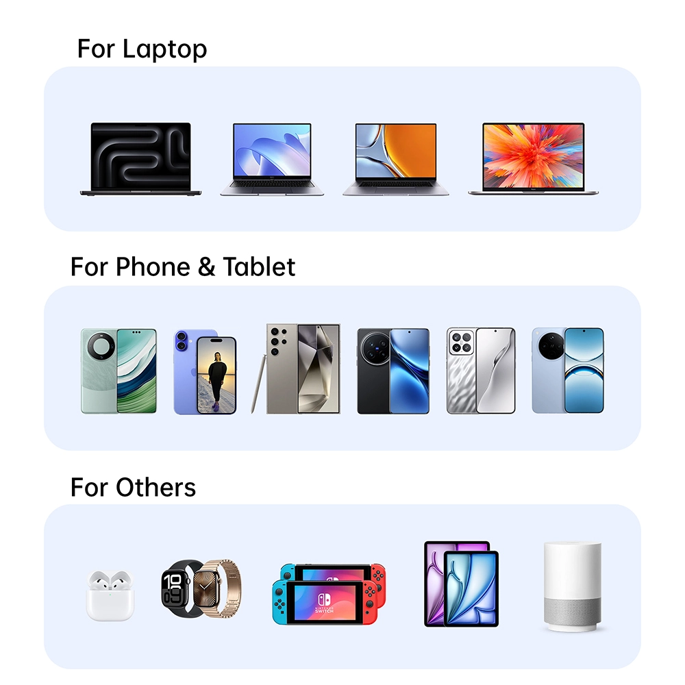 Potente salida de 100 W: la estación de energía de tu portátil En esencia, los puertos USB-C1 y C2 admiten cada uno potencias máximas de hasta 100W. Esta poderosa capacidad de transmisión es suficiente para cumplir con los requisitos de carga rápida de la mayoría de las computadoras portátiles. Ya sea que esté utilizando una MacBook Pro u otras ultrabooks de alto rendimiento, su rendimiento de carga puede ser comparable al de los cargadores originales, o incluso más rápido. Manténgase enérgico, concéntrese en la creación y la productividad, y no se preocupe por la duración de la batería cuando utilice el dispositivo.